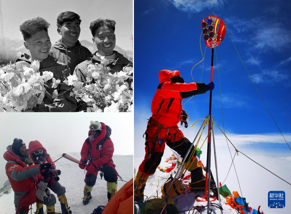 拼版照片:左上图为1960年5月登上珠穆朗玛峰顶的中国登山队队员王富洲(右)、贡布(中)和屈银华(资料照片 新华社发);左下图为2008年5月8日,北京奥运圣火珠峰传递登山队队员罗布占堆(左)点燃第一棒火炬手吉吉手中的“祥云”火炬(新华社发);右图为2020珠峰高程测量登山队队员在珠穆朗玛峰峰顶开展测量工作(2020年5月27日新华社特约记者扎西次仁摄)。新华社发