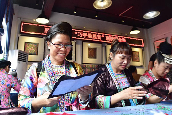 7月29日,绣娘在广西融水苗族自治县苗锦文化中心参加比赛。 当日,融水苗族自治县举办首届“巧手助脱贫”刺绣擂台赛,全县40多名绣娘参加比赛。