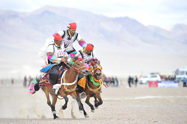 7月29日,参赛选手进行马术表演。 当日,西藏阿里地区在狮泉河镇举行赛马竞技大赛,比赛项目有骑马拾哈达、捡茶砖、骑马射箭、马术表演等,共有150名农牧民选手参加比赛,吸引了2万余名观众前来观看。