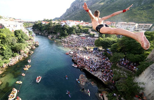 当地时间7月29日,参赛者在波黑莫斯塔的一座古桥上参加第452届跳水比赛。莫斯塔尔古桥高28米,始建于16世纪,1993年毁于波黑战争,2004年重建开放,2005年古桥及其周边区域被联合国教科文组织列为世界遗产。古桥跳水活动最早记载于17世纪,1968年当地开始组织正式的夏季跳水比赛,每年都吸引大批游客观看。
