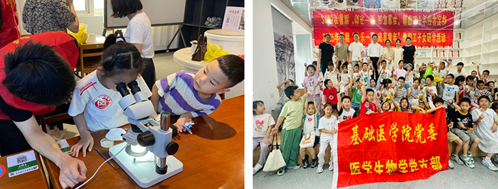 “显微镜观察细菌和寄生虫形态”课程中,检验学院的老师给孩子们上了一堂生动的卫生科普课。孩子们通过显微镜观察形态各异的细菌和寄生虫,连连发出此起彼伏的惊叹声,了解到良好卫生习惯的重要性。在“奇妙的微生物世界”科普讲座中,基础医学院的老师首先通过生动的讲解和精美的图片展示,带领孩子们探寻微生物的奥秘。然后,开展“叶间奇遇记”书签 DIY 活动,孩子们将收集来的树叶进行创意加工,用彩笔为树叶画上可爱的图案,再配上精致的丝带,制作成独一无二的书签。