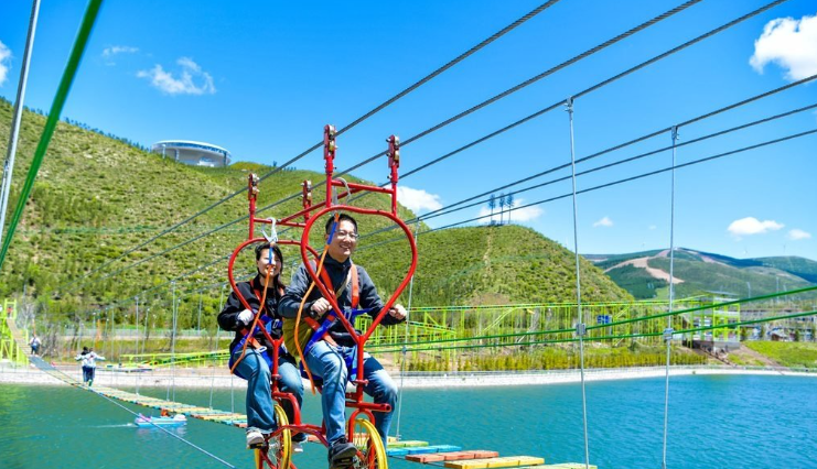 6月21日,正值周六,在张家口崇礼奥林匹克公园,如意水岸乐园的高空漂流项目正传来阵阵尖叫。5月31日,如意水岸乐园试营业,引来大批游客体验高空漂流、云端独木桥、高空自行车等娱乐项目。