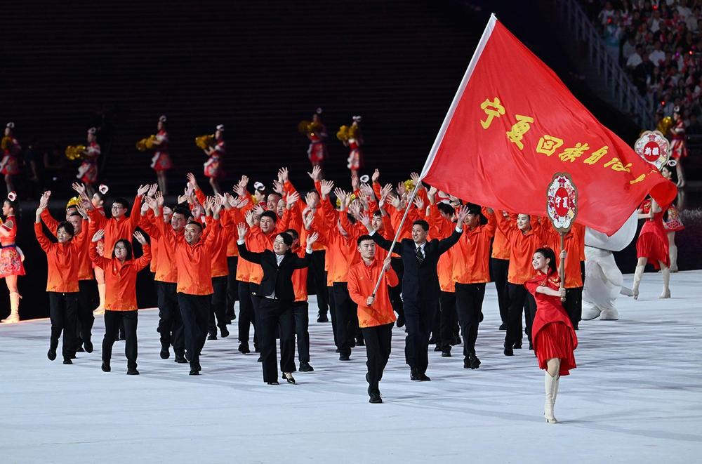 开幕式上,宁夏代表团第二十九个踏入广东奥体中心,代表团成员接受来自全场的欢呼。运动员们向全场观众挥手致意,他们坚毅的眼神、自信的笑容,与全场观众期待的目光交汇。他们的步伐,踏出了塞上江南的沉稳,也带着黄河奔流的激情。