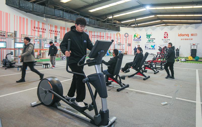 12月18日,在位于山东德州乐陵市的泰山体育产业集团有限公司,市民在体验健身器材。 新华社发(王福东摄)
