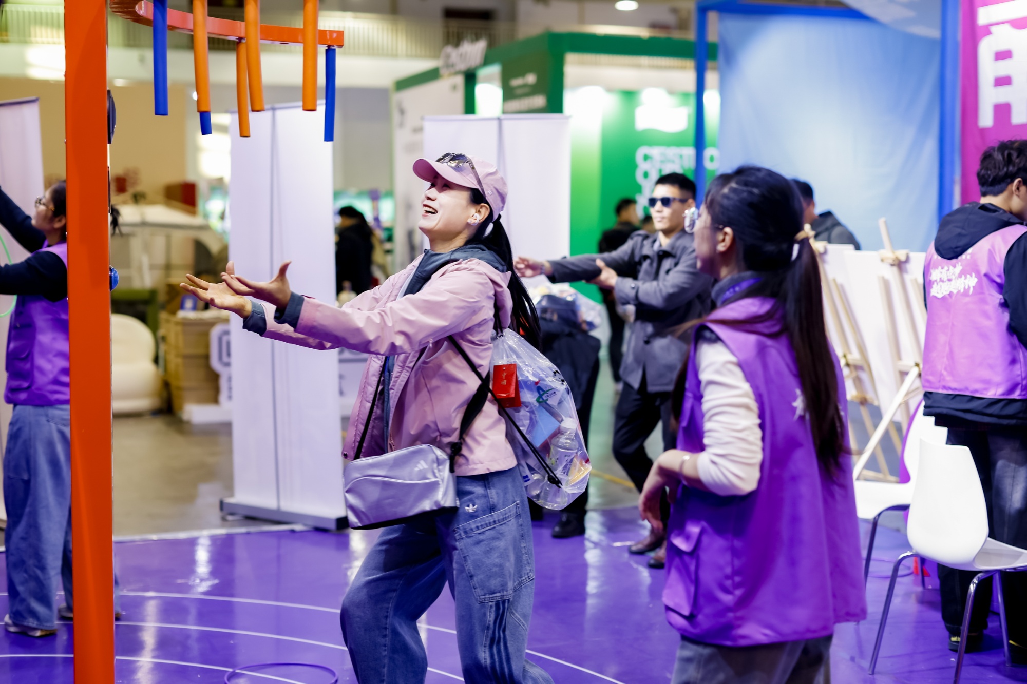 本届体博会展览面积达1.5万余平方米,汇聚本土与国际众多知名品牌,累计接待观众超5万人次,其中马拉松选手及家属占比达65%以上。走进7号馆,迪卡侬打造的“能量竞技场”成为全场人气焦点。高尔夫推杆体验区排起长龙,射箭靶位前围满跃跃欲试的观众,冰壶体验区不时传来欢呼与掌声。“从早到晚,体验项目就没停过,排队的人一直延伸到通道上。”迪卡侬工作人员介绍,三天人流如织,不少家庭都是体验完直接下单购买。