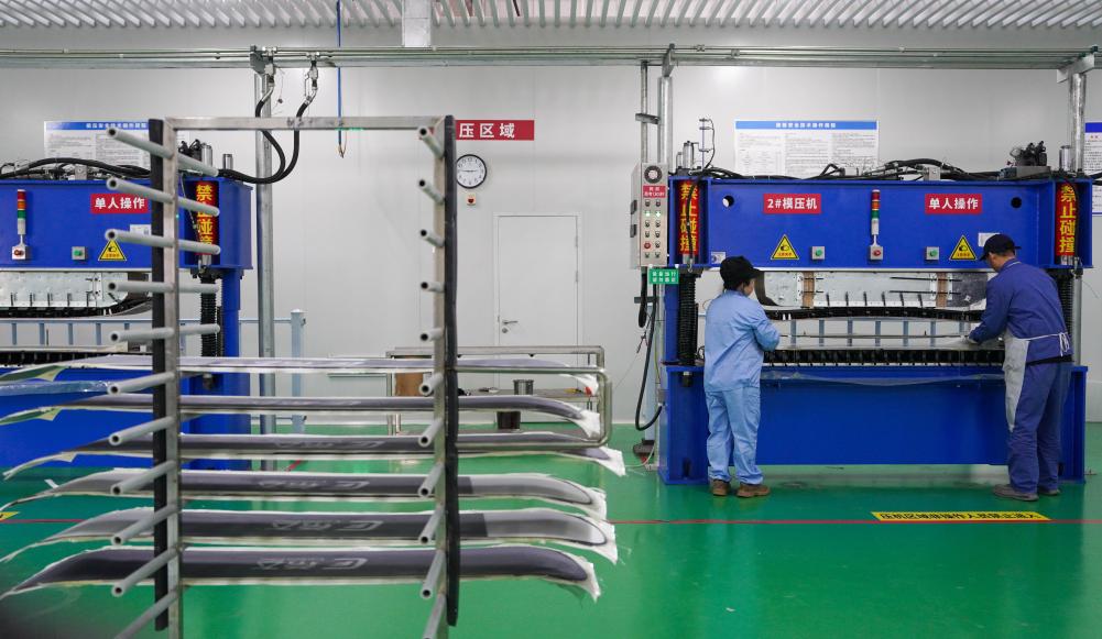 2025年12月4日,在吉林化纤国兴复合材料有限公司车间内,工作人员用模压机制作碳纤维滑雪板。新华社记者 颜麟蕴 摄