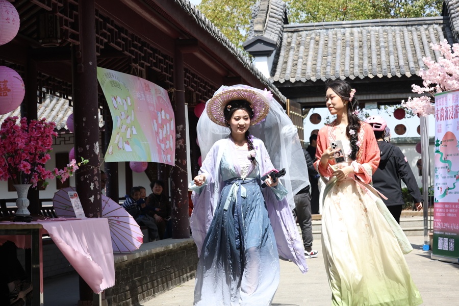 今年的桃花节,这支队伍就集体出动了。在川沙新镇连民村里一处古色古香的老宅院,演员们就地上演了一处李白作诗的“古偶剧”;随处可见的NPC(非玩家角色)一会儿拉着你投壶,一会儿拉着你射箭,对出飞花令还可以领取桃花冰箱贴。玩儿累了,水榭楼台处,点心、卤味、茶水也备齐了。
