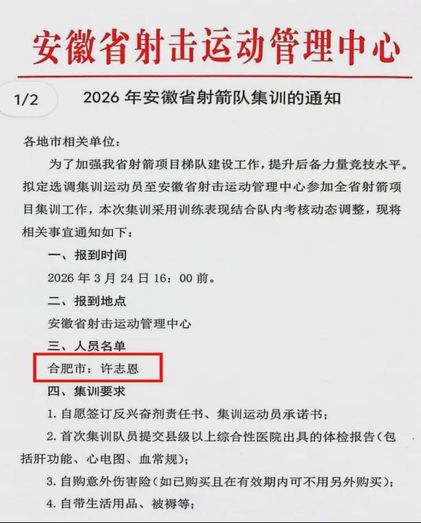 近日,安徽省射击运动管理中心正式发布《2026年安徽省射箭队集训的通知》,我校射箭运动员许志恩凭借扎实的竞技功底与出色的赛场表现,成功入选全省射箭项目集训名单,