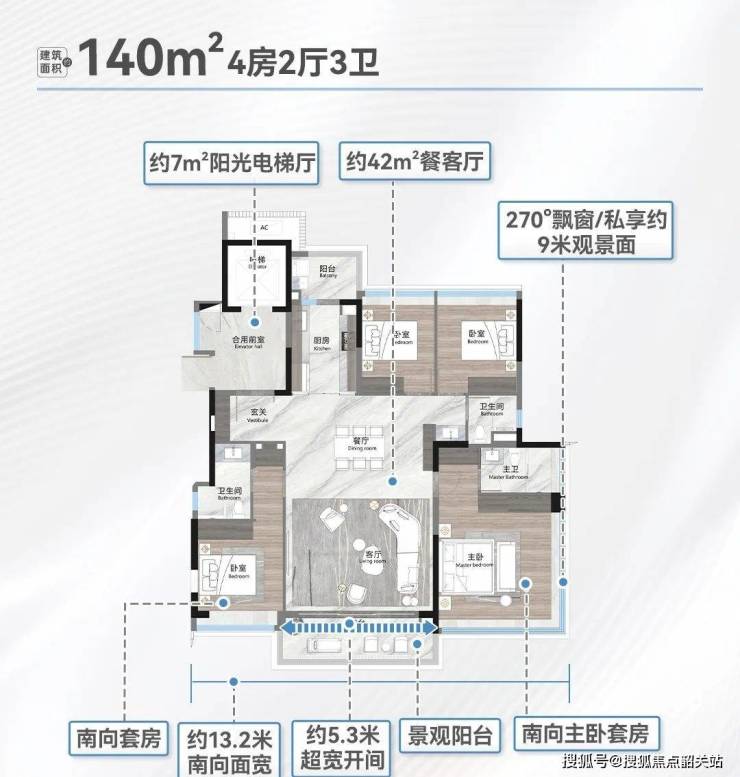140㎡四房三卫:入门级户型,部分户型可望见湖景,双套房设计,总价约为1000-1300万元。