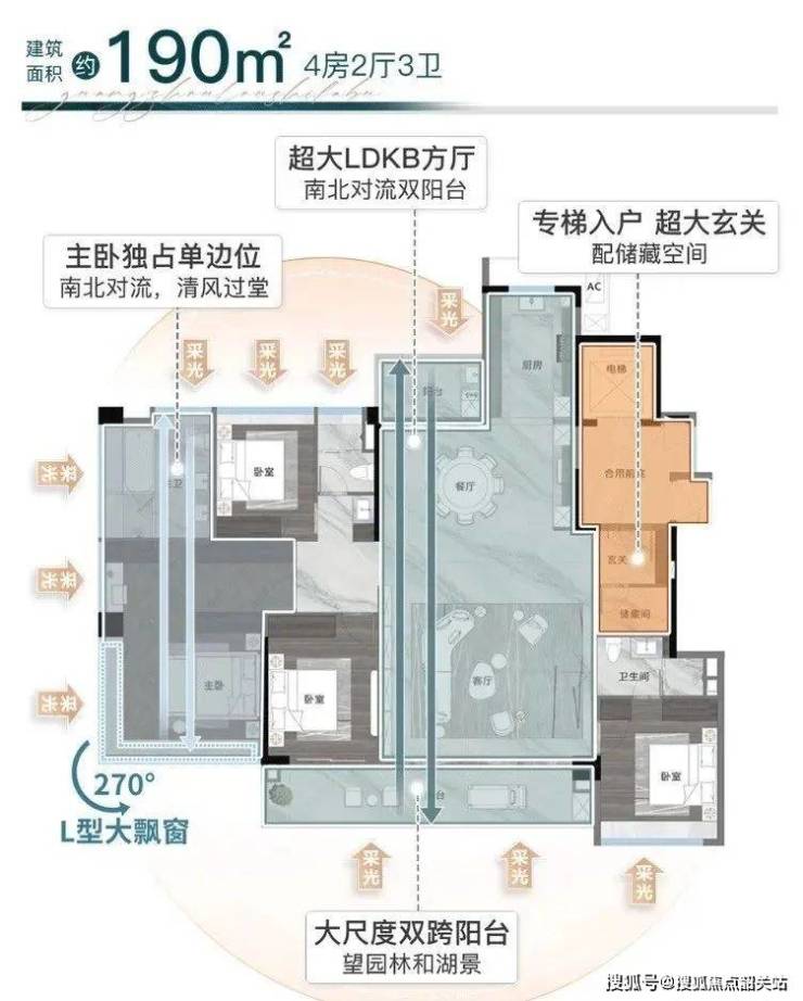 190㎡四房三卫:四开间朝南,9.4米观景阳台,超大主卧,总价约为1480-1600万元。