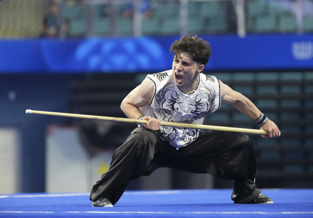 8月8日,伊朗选手巴尼塔莱比在2025年成都世运会男子南拳-南棍项目的南棍比赛中。