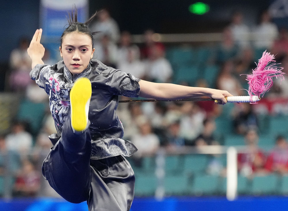 8月9日,马来西亚选手彭牬尔在2025年成都世运会女子长拳-剑术-枪术项目的剑术比赛中。