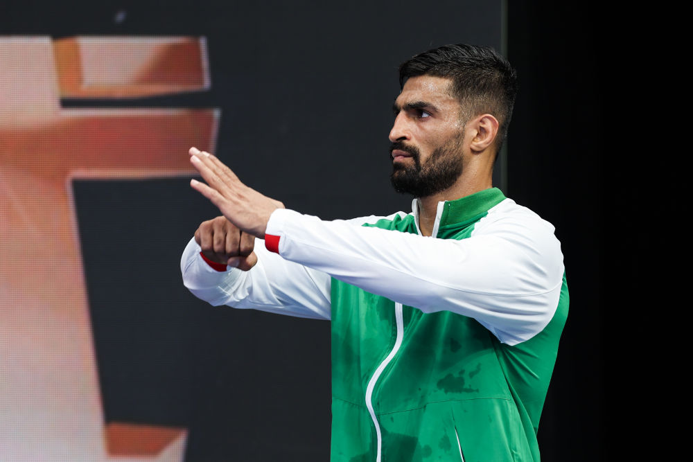 8月12日,2025年成都世运会武术男子散打85公斤级亚军伊朗选手穆罕默德礼萨在领奖台上向观众致意。