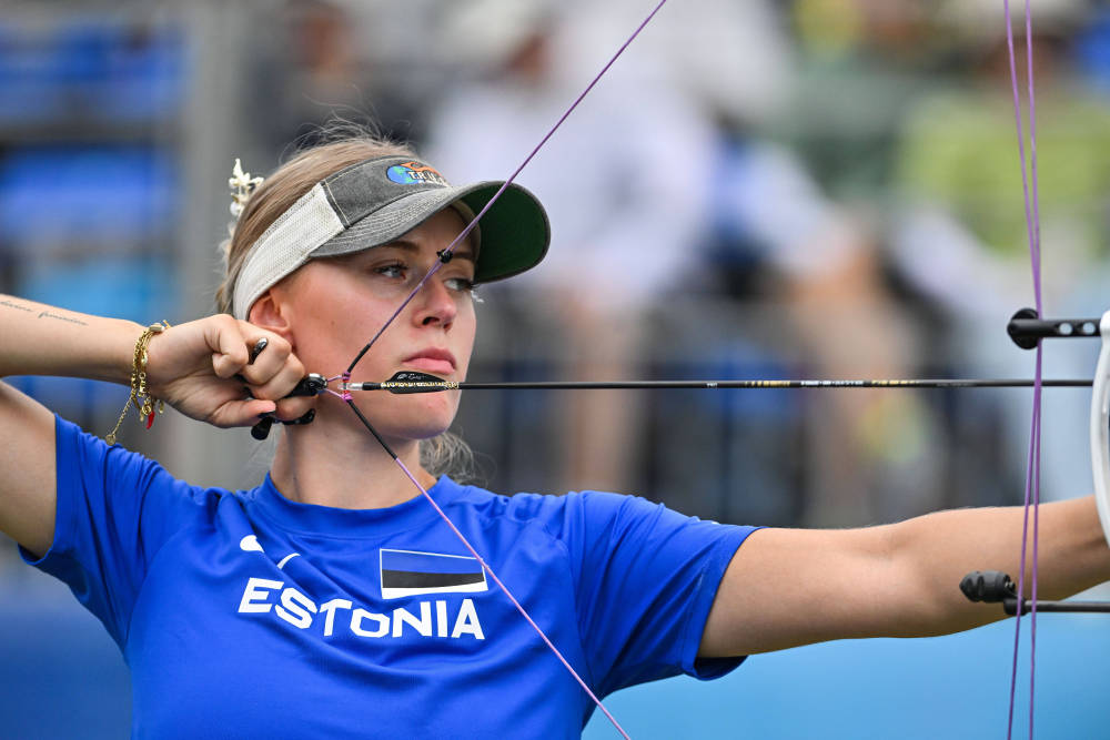 8月8日,爱沙尼亚选手克丽斯廷·莱特(中)在2025年成都世运会掷准飞盘混合双人预赛后与观众合影。