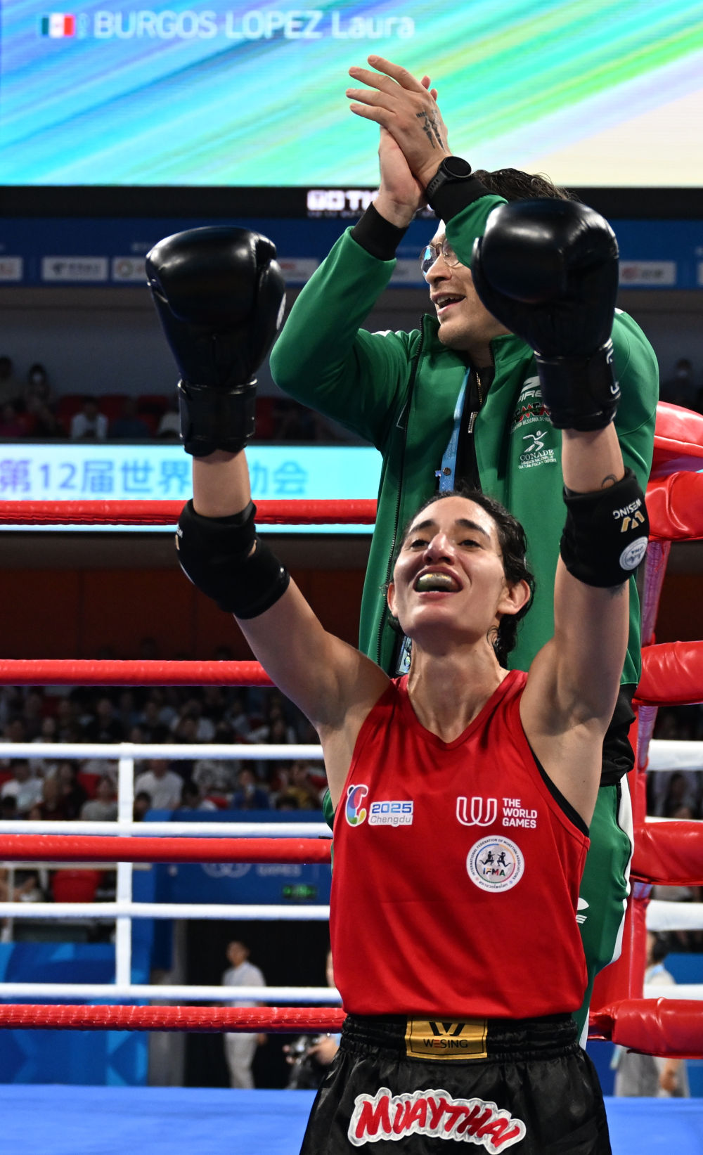8月10日,墨西哥选手布尔戈斯·洛佩斯(前)在夺得2025年成都世运会泰拳女子48公斤级冠军后庆祝。泰拳起源于泰国,最初是泰民族使用的军事技法,后传入民间,逐渐演变为现代的泰拳运动。