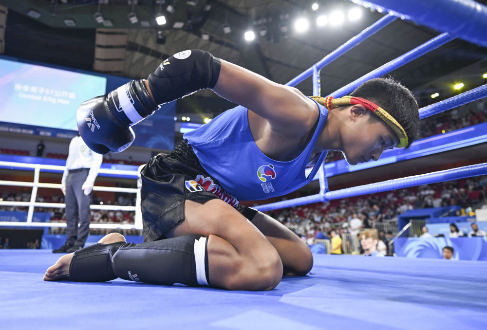 8月8日,中国选手杨羽习在2025年成都世运会泰拳四分之一决赛比赛前表演拜师舞。