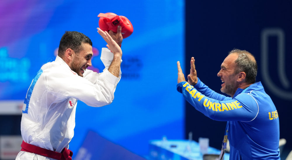 8月9日,乌克兰选手塔利博夫(左)在2025年成都世运会空手道男子组手84公斤以上级比赛夺冠后与教练庆祝。