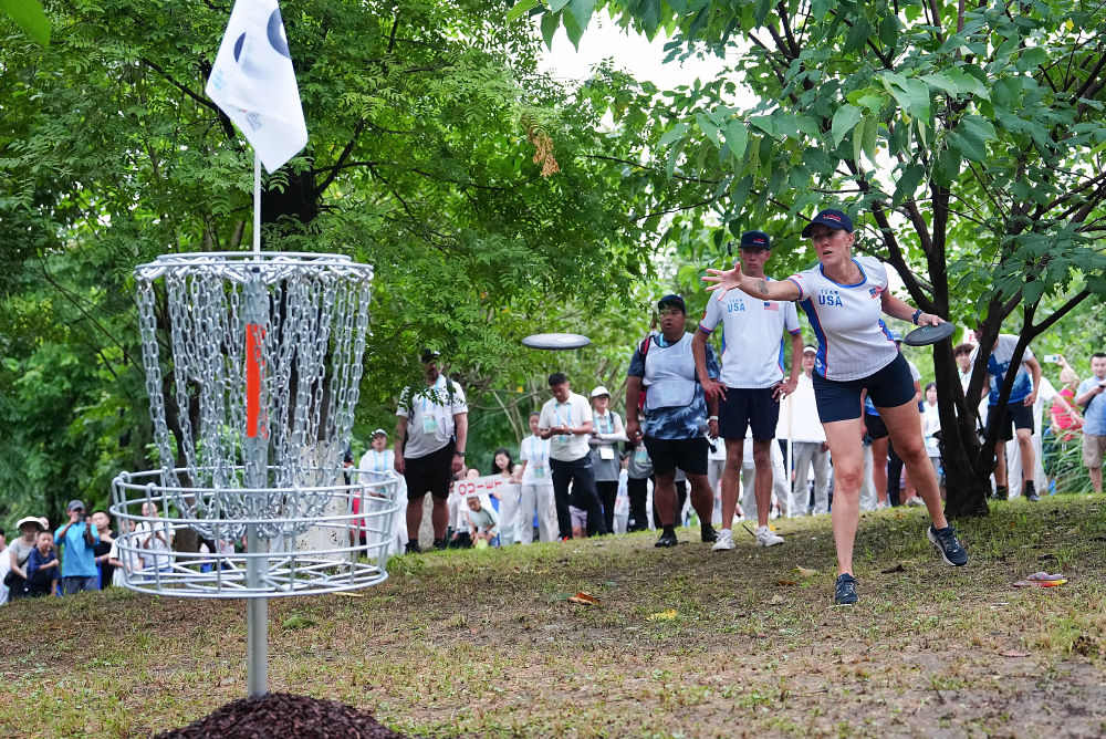 8月10日,美国队选手甘农(前)在2025年成都世运会掷准飞盘混合双人决赛中。