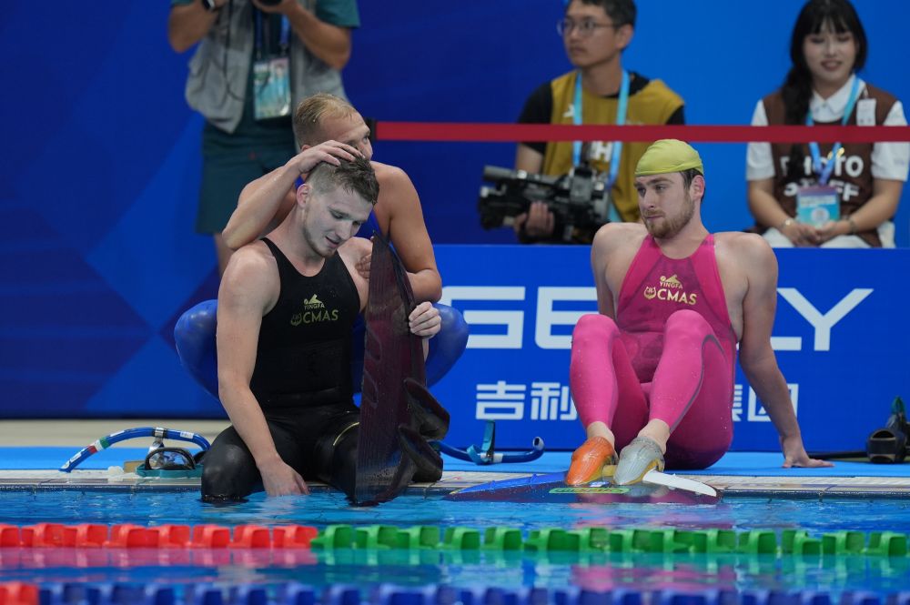 8月10日,在2025年成都世运会男子索道滑水决赛后,菲律宾选手特立尼达(右)庆祝法国选手德绍获得冠军。