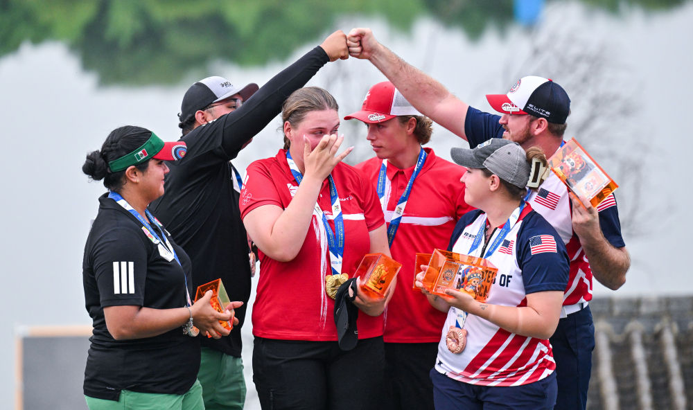 8月8日,2025年成都世运会射准射箭复合弓混合团体赛的冠军丹麦队、亚军墨西哥队与季军美国队在颁奖仪式上。