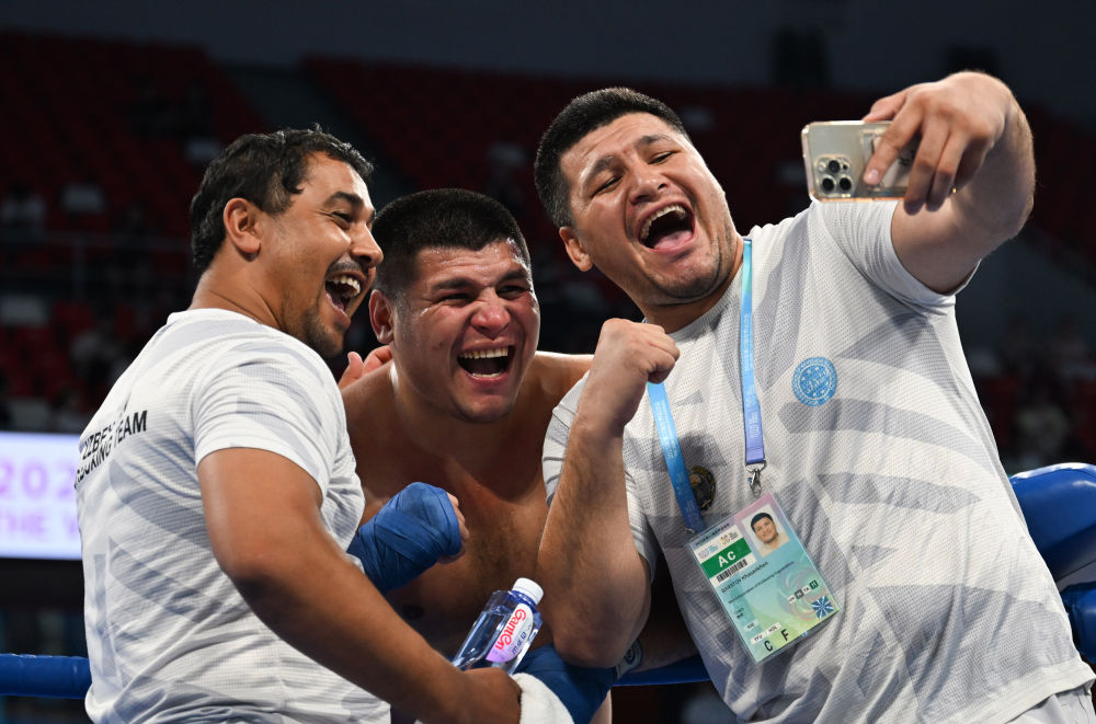 2025年8月14日,在成都世运会自由搏击男子K1 91公斤以上级铜牌赛中,乌兹别克斯坦选手巴拉托夫战胜法国选手库利巴利,获得铜牌。图为巴拉托夫(中)与教练在比赛后自拍庆祝胜利。新华社记者 张博文 摄